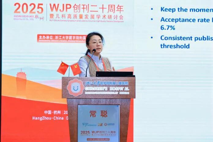 Dr. Chang Cong, Executive Publisher for Medicine and Life Sciences at Springer Nature, presented the "WJP 2024-2025 Development Report and Outlook." Using detailed metrics, she highlighted the journal's growing international author base, optimized review cycles, strong performance of open access articles, and rising social media influence. Future priorities include strengthening international commissioned papers, enhancing content quality, and boosting engagement.